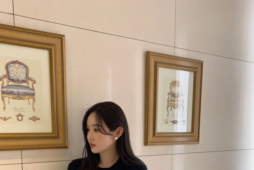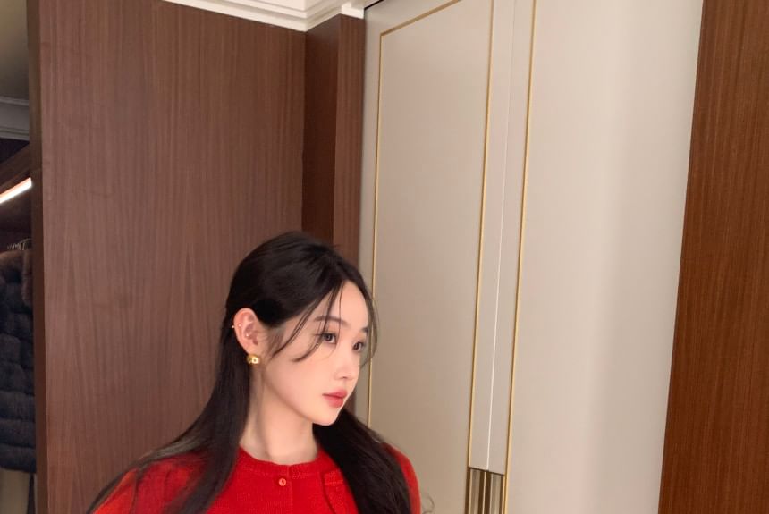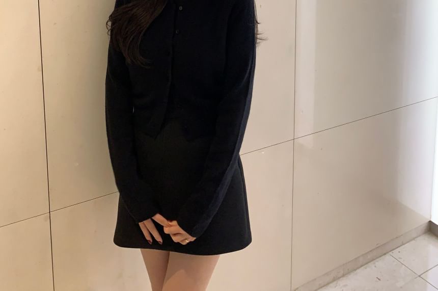 Set: Short-Sleeve Round Neck Plain Knit Top + Cardigan