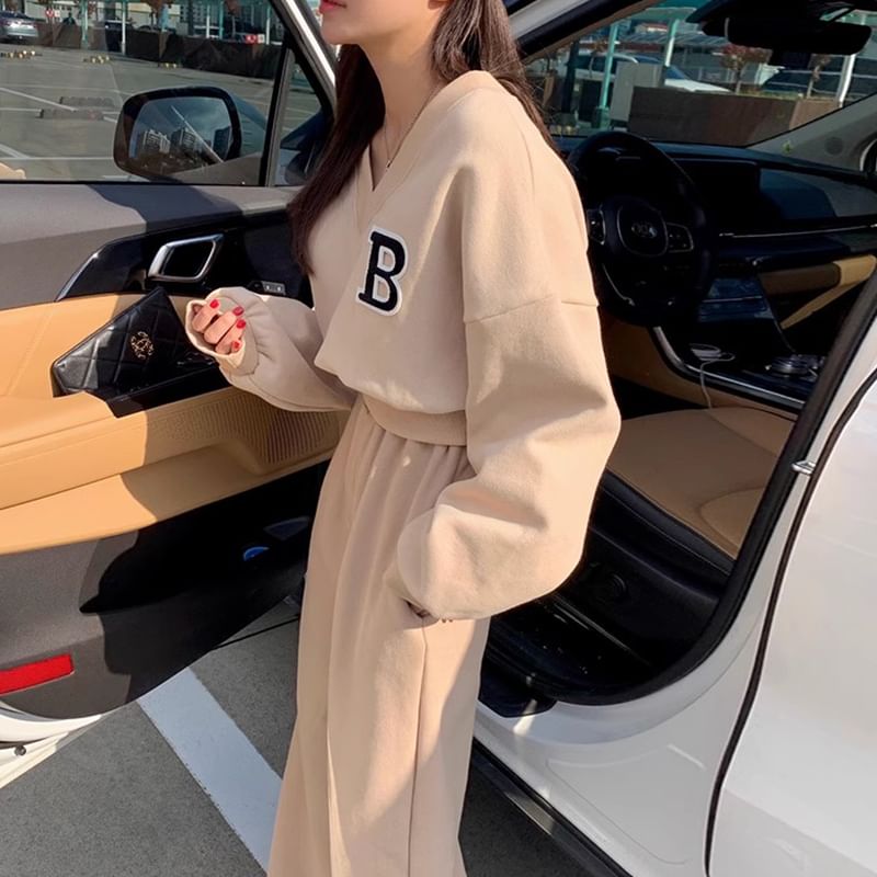 Set: V-Neck Lettering Pullover + Elastic Waist Plain Wide Leg Sweatpants