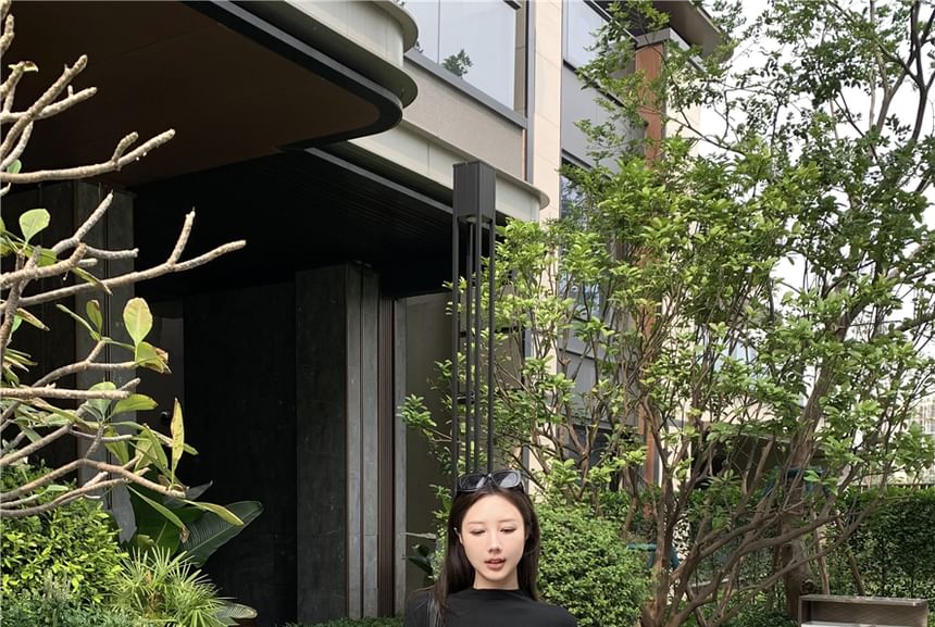 Short-Sleeve Tee Slim Crop Fit Neck Mock Maxi Skirt Mid Plain Waist / A-Line