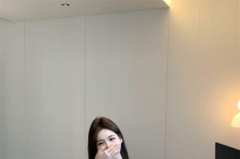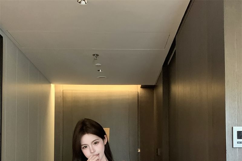 Shorts Waist High Tie Satin Front Top Long Plain / Off Lace Cami V-Neck Shoulder Sleeve