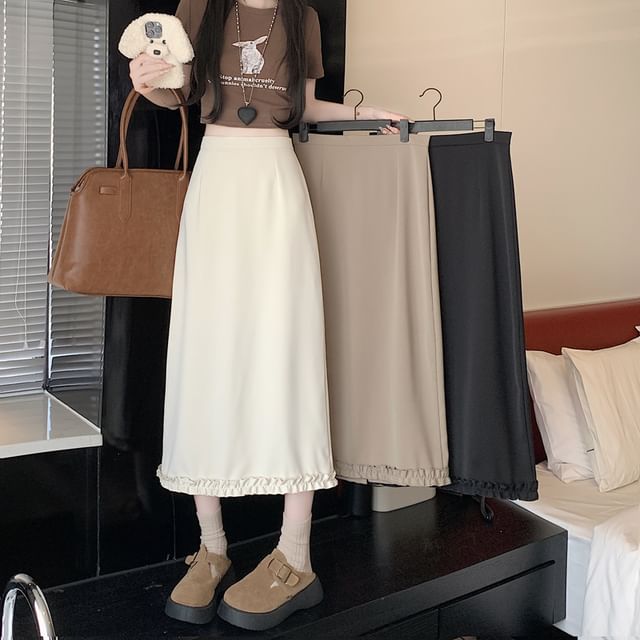 High Rise Plain Slit Ruffle Trim Midi A-Line Skirt