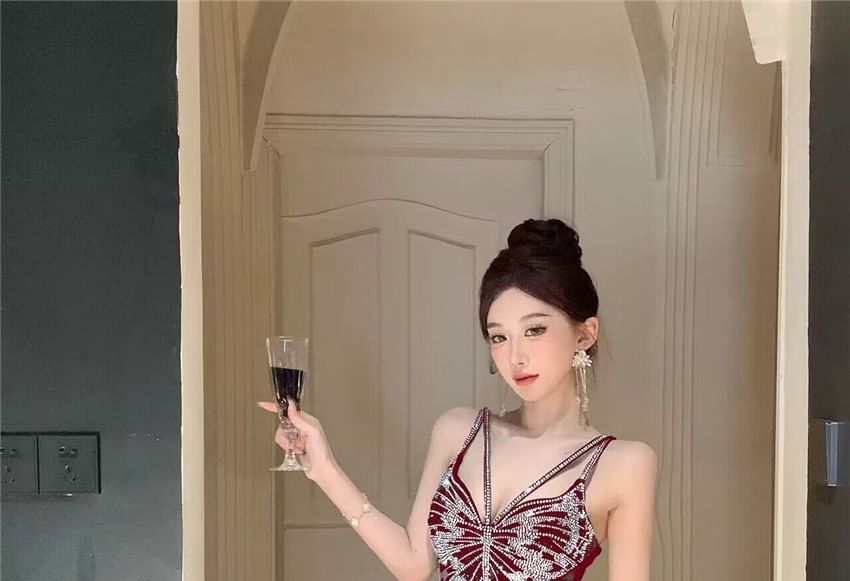 Spaghetti Open V-Neck Gown Rhinestone Back Strap Slit Evening Mermaid Butterfly Velvet
