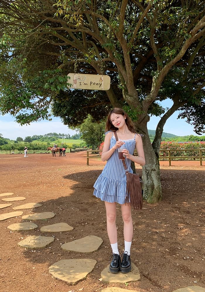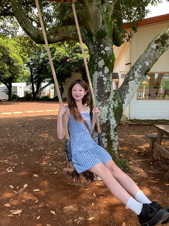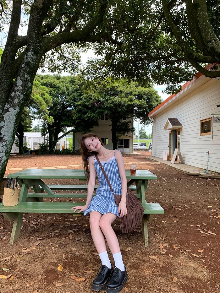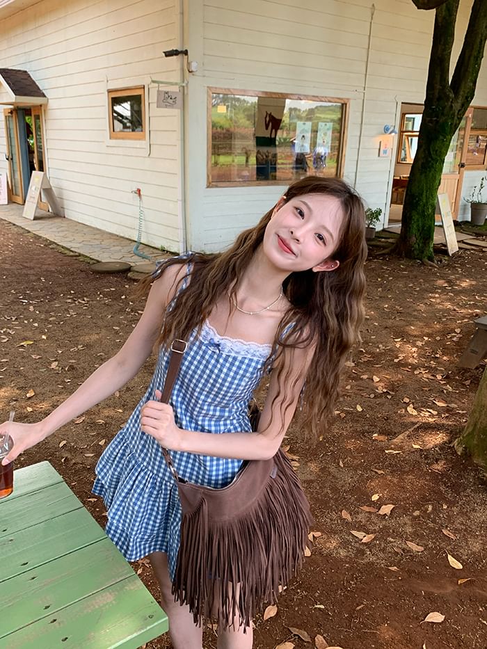 Strap Spaghetti Trim Mini Dress Layered Lace A-Line Gingham V-Neck