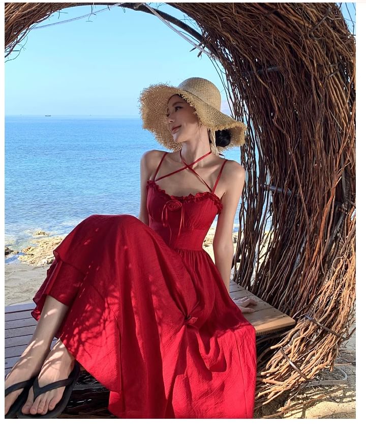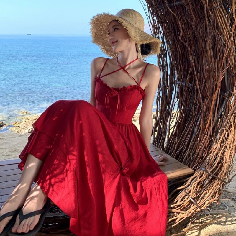 Sundress Strap Maxi Spaghetti Flower Plain Detail Ruffle
