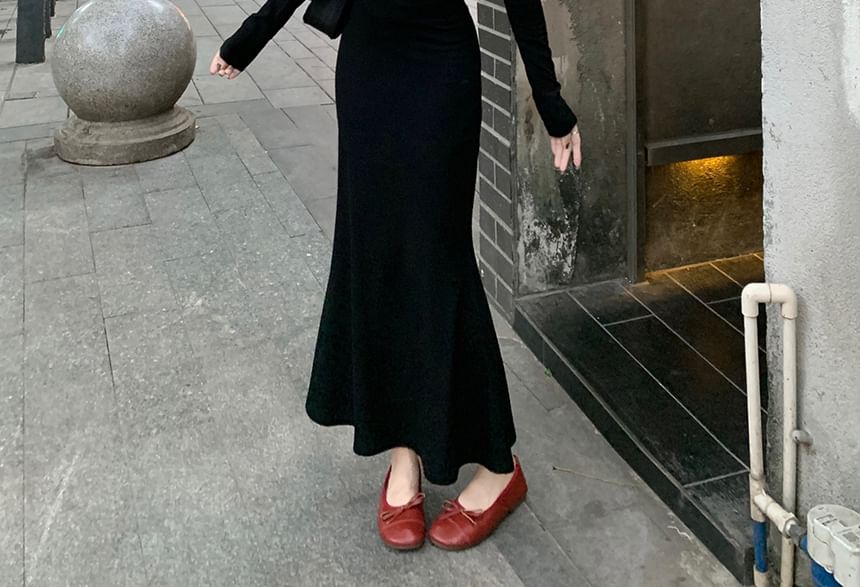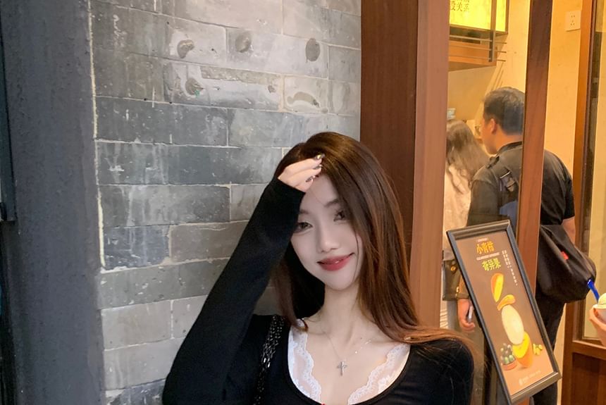 V-Neck Lace Crop Tank Top / Long-Sleeve Scoop Neck Plain Bow Accent Cutout Maxi Mermaid Dress