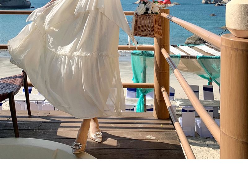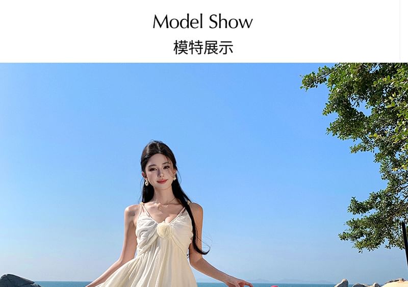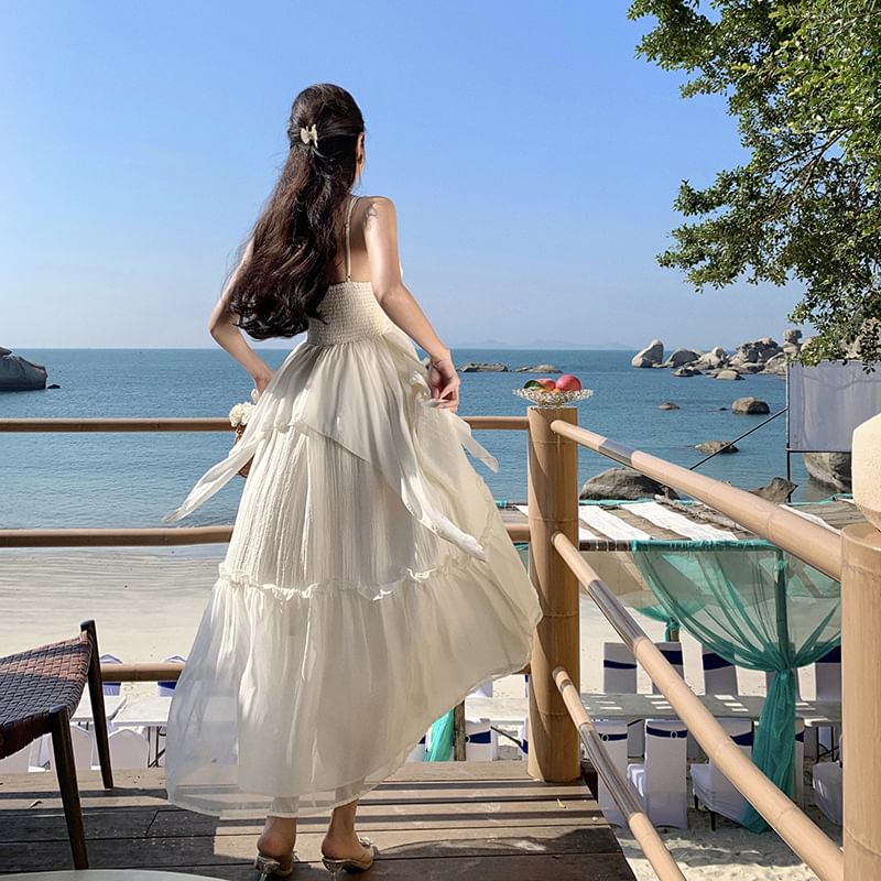 V-Neck Strap Maxi Trim Plain Dress Ruffle Spaghetti A-Line