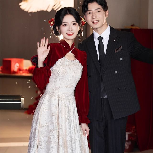 Puff-Sleeve Floral Jacquard Faux Pearl A-Line Chinese Wedding Dress