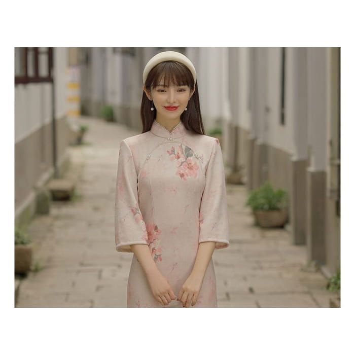 3/4-Sleeve Floral Print Faux Pearl Faux Suede Midi Sheath Qipao