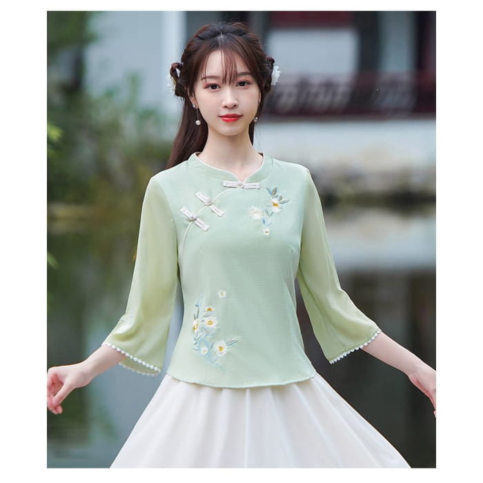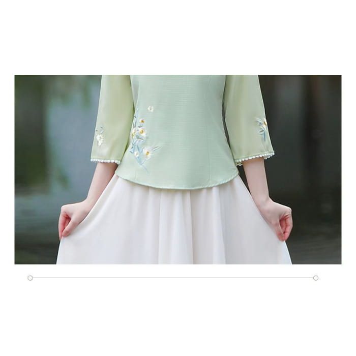 3/4-Sleeve V-Neck Floral Hanfu Top / High Waist Midi A-Line Skirt / Set