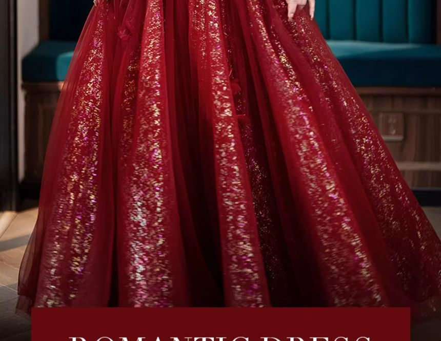 A-Line Accent Evening Flower Gown Sequin Short-Sleeve