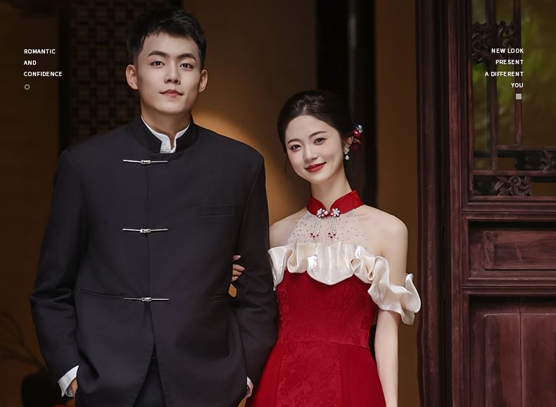 A-Line Cold-Shoulder Evening Asymmetrical Halter Mandarin Collar