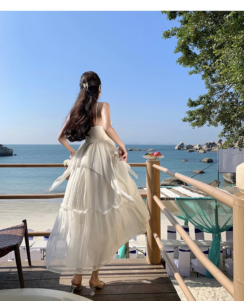 Spaghetti Strap V-Neck Plain Ruffle Trim Maxi A-Line Dress