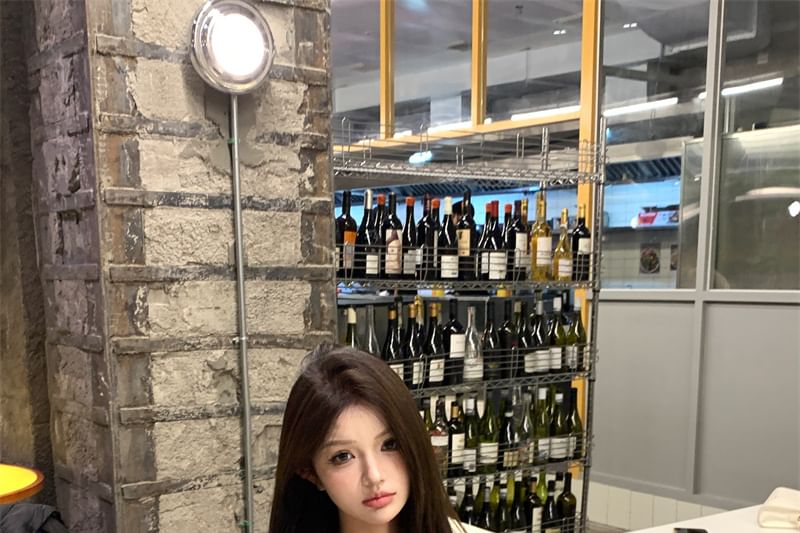 Mock Two-Piece Long-Sleeve Off-Shoulder Striped Panel Smocked Crop Blouse / High Waist Mini A-Line Skirt / Belt / Set