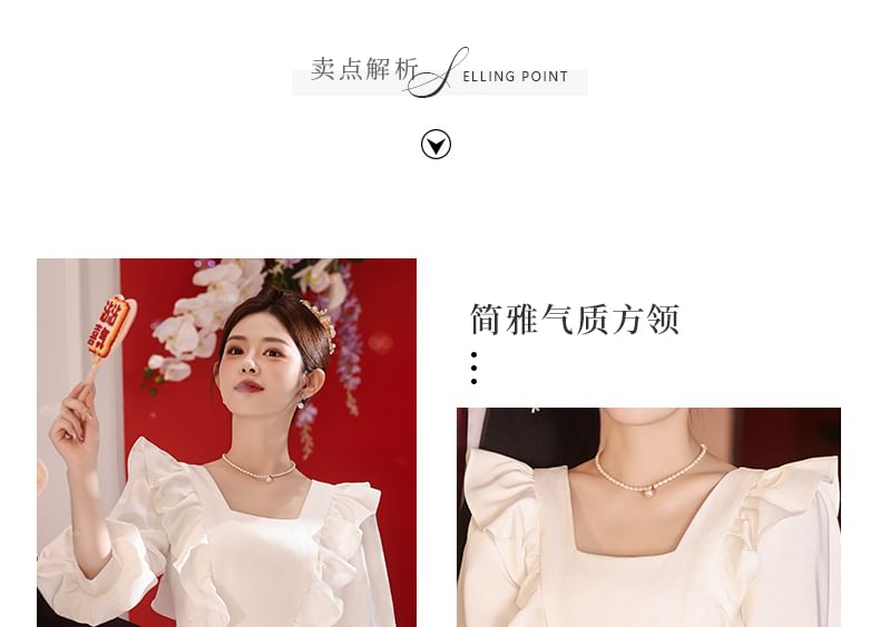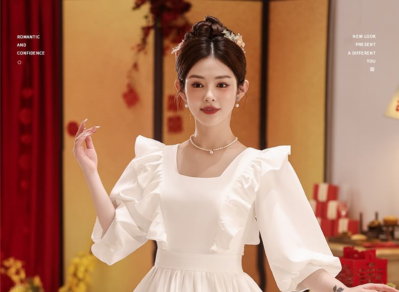 3/4-Sleeve Square Neck Plain Ruffle Trim Midi A-Line Cocktail Dress