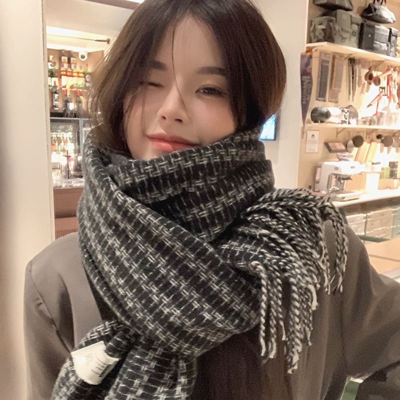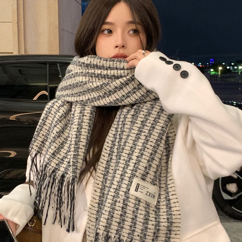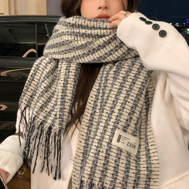 Patterned Label Applique Tasseled Scarf