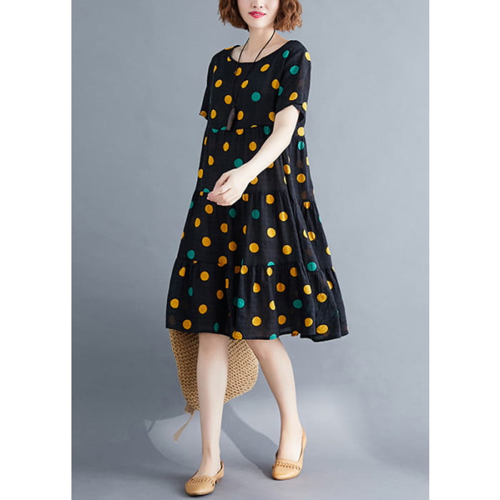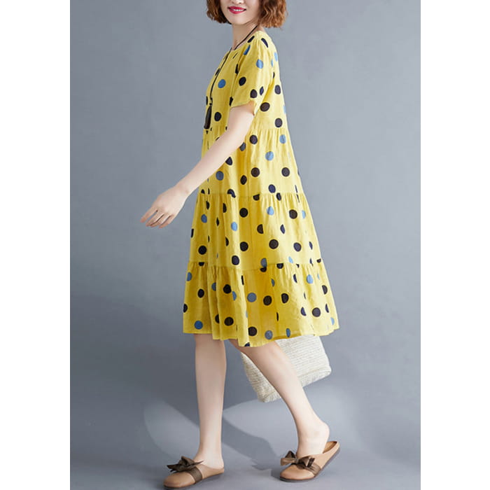 Art Yellow Dot Print Patchwork Holiday Mid Dress Short Sleeve VB1026