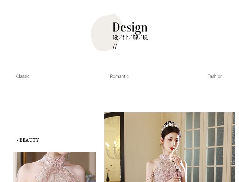 Halter Mock Neck Faux Pearl Fringed Cutout Back A-Line Evening Gown