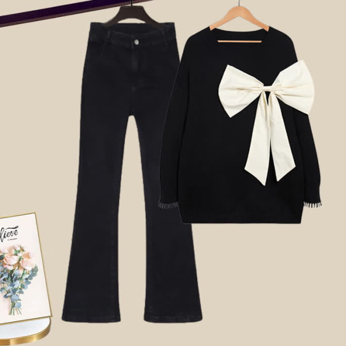 Elevate your style with our Black Bow Decor Knit Sweater Denim Pants Set. Crafted with a touch of elegance, this set features a black bow detail on the knit sweater and denim pants for a chic look. Perfect for any occasion, it offers comfort and style in one gorgeous set.