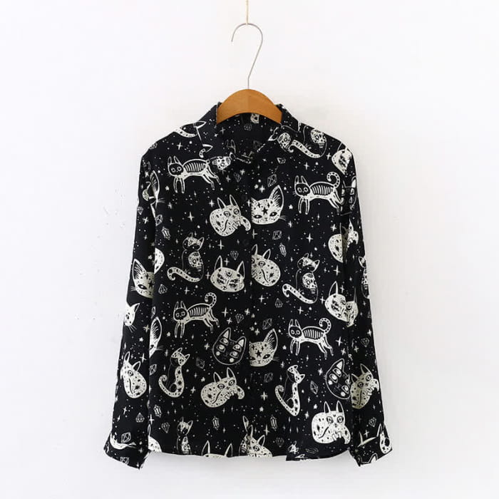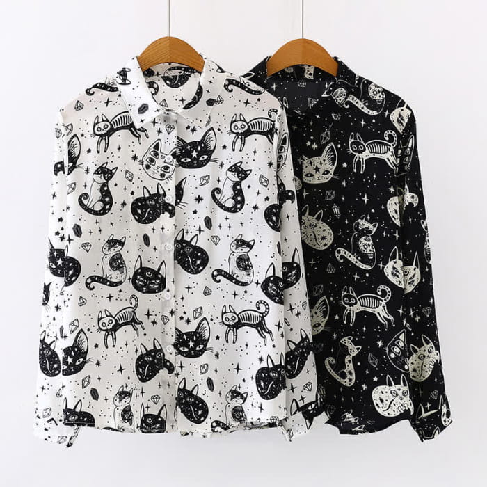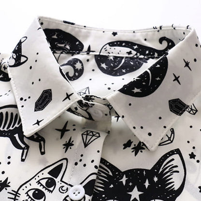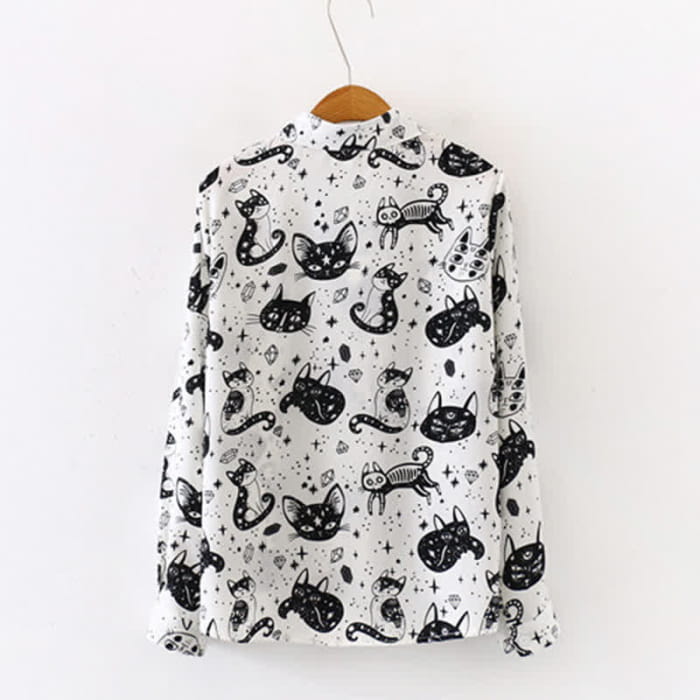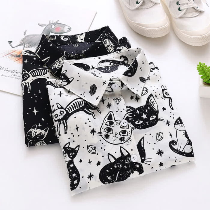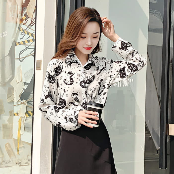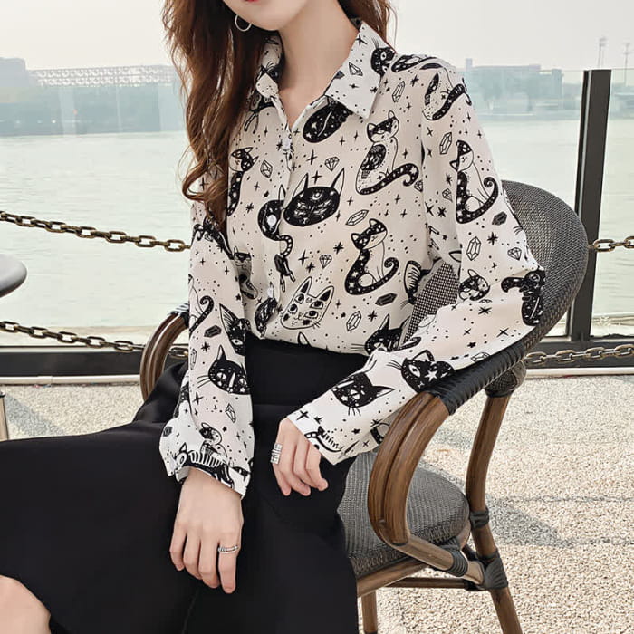 Elevate your style with our Black White Kitty Print Lapel Chiffon Shirt. Its elegant design showcases a playful black and white kitty print, perfect for the sophisticated cat lover. The airy chiffon fabric adds a feminine touch, while the lapel collar exudes sophistication. Experience comfort and style in one.