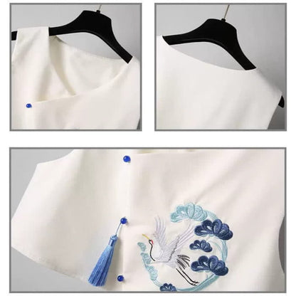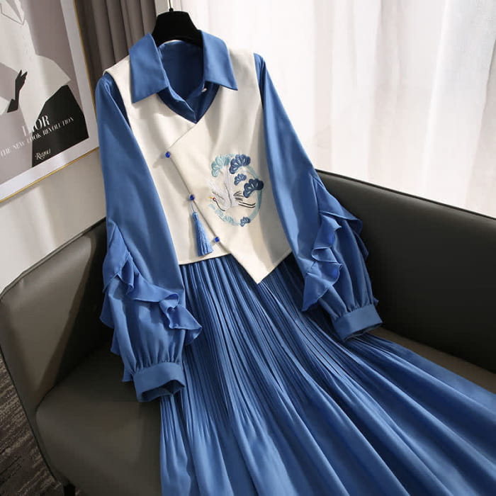 Blue Crane Embroidery Fringed Vest Lapel Dress Set