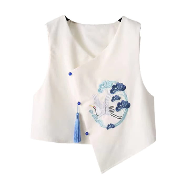 Elevate your style with our Blue Crane Embroidery Fringed Vest Lapel Dress Set. Featuring intricate embroidery and a fringed hem, this elegant set adds a touch of sophistication to any outfit. Perfect for a night out or a special occasion, this dress set will make you stand out in all the right ways.