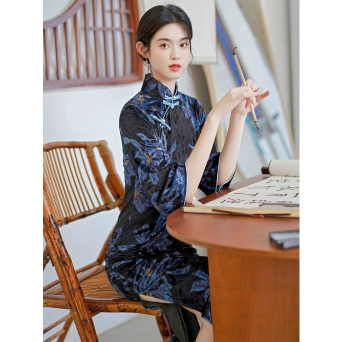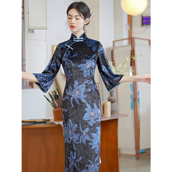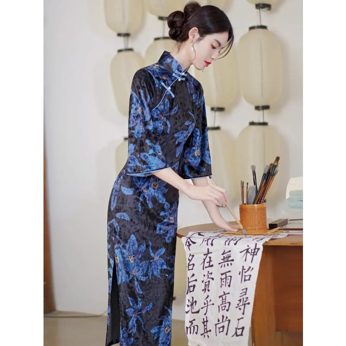 Blue Floral Cheongsam Dress