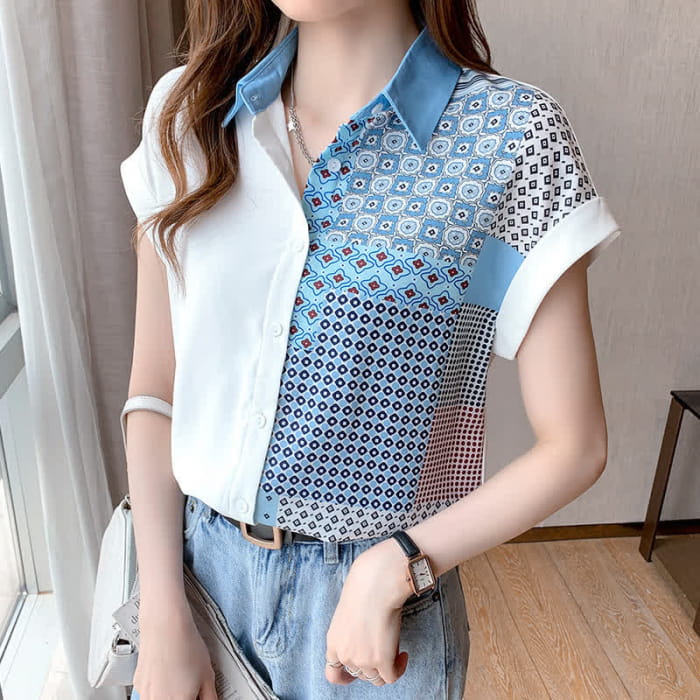 Add a touch of elegance to your wardrobe with our Blue Floral Colorblock Lapel Shirt. The unique combination of blue floral print and colorblock design is perfect for making a bold fashion statement. The lapel adds a sophisticated touch, making this shirt the perfect choice for any elegant occasion.
