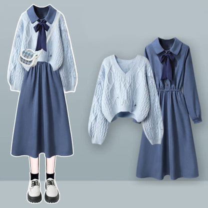 Blue Knit Sweater Bow Tie Lapel A-line Dress