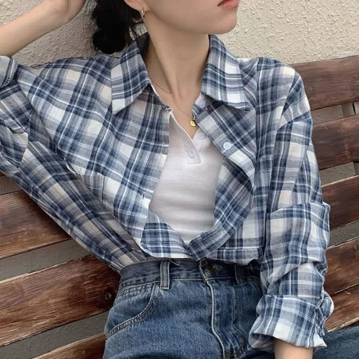 Introducing our elegant Blue Plaid Print Pocket Long Sleeve Lapel Shirt. Featuring a timeless blue plaid print and convenient pocket, this long sleeve lapel shirt offers both style and function. Perfect for any occasion, this shirt is a must-have for any wardrobe.