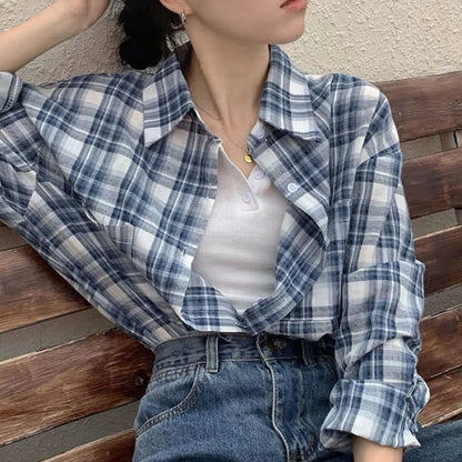 Blue Plaid Print Pocket Long Sleeve Lapel Shirt