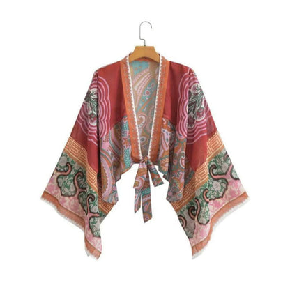Effortlessly stylish and elegant, our Boho Print Lace Up Cardigan Kimono Outerwear adds a touch of sophistication to any outfit. The intricate boho print and delicate lace up details elevate this outerwear, while providing a comfortable and flattering fit. Perfect for a chic and bohemian look.