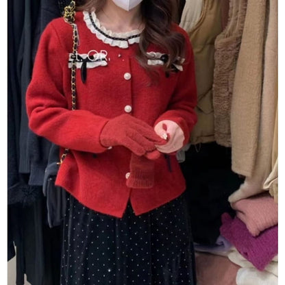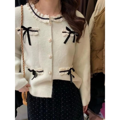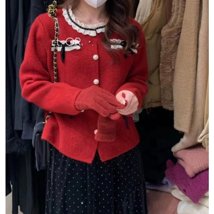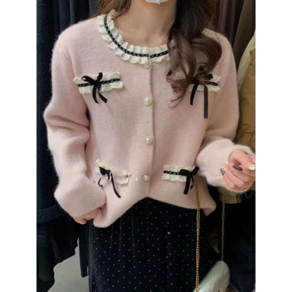 Bow-Accent Lace-Trim Crew-Neck Cardigan