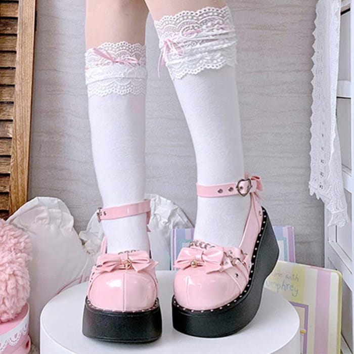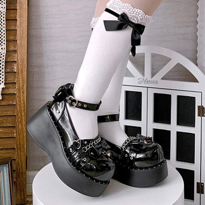 Elevate your style with the elegant Bow Knot Chain Lolita Mary Janes Shoes. These shoes feature a unique bow knot and chain design, perfect for adding a touch of sophistication to any outfit. Step out in style and comfort with these versatile and stylish shoes.
