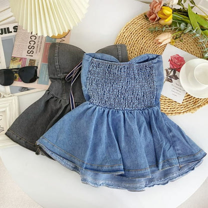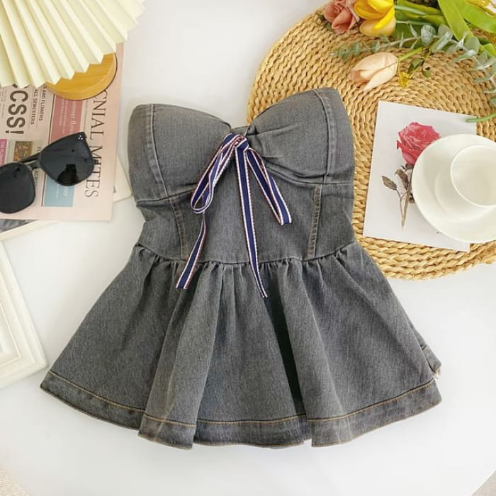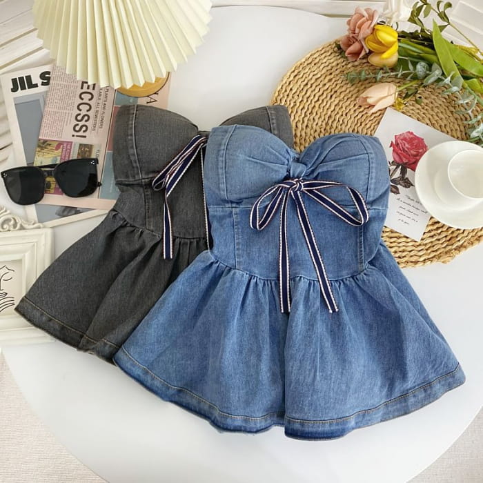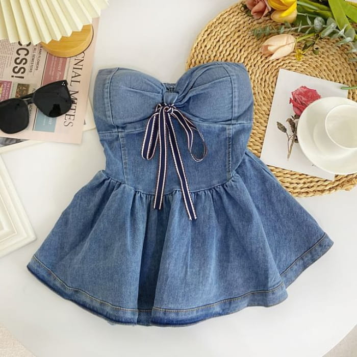 Bow Peplum Washed Denim Tube Top