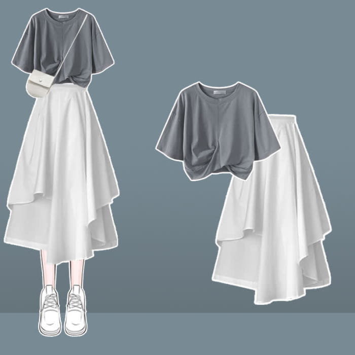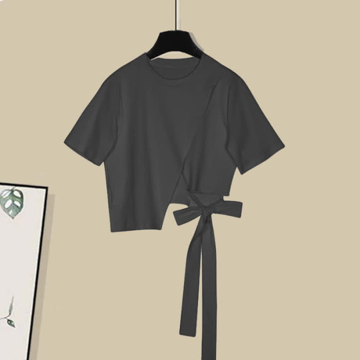 Add style and elegance to your wardrobe with our Bow Round Collar Bowknot Crop T-Shirt Irregular Skirt. The delicate bow detail and asymmetrical design make this outfit perfect for any occasion. Be the center of attention and elevate your look with this must-have ensemble.
