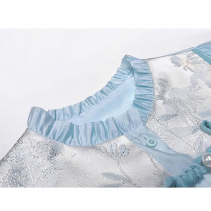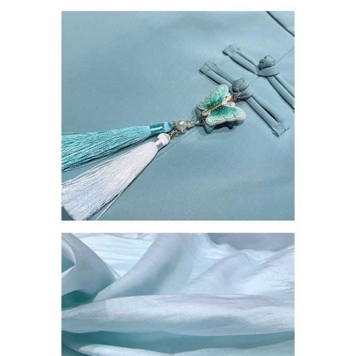 Bule Floral Embroidery Shirt Slit Skirt Set