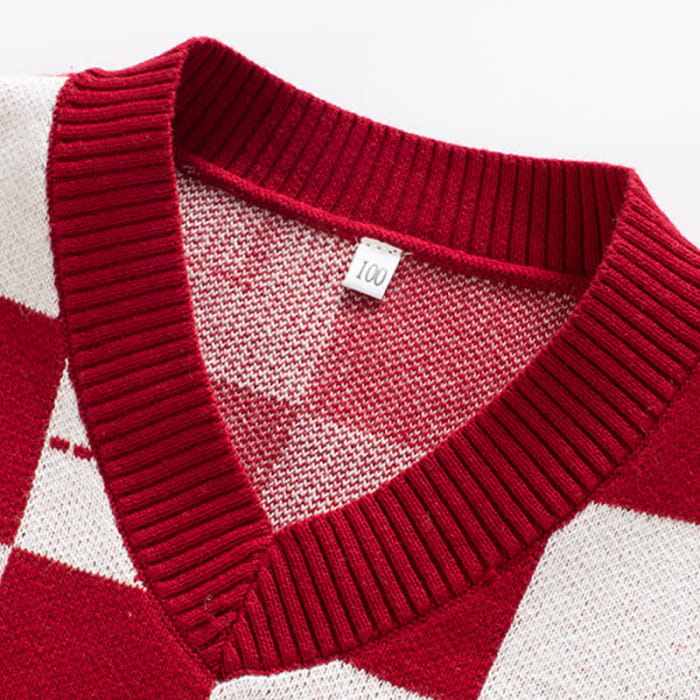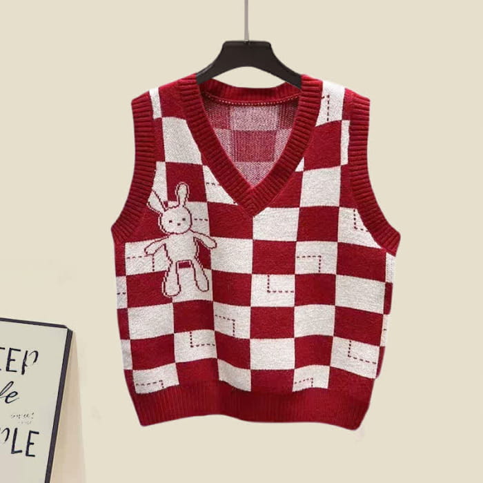Bunny Lattice Print Vest Pleated Shirt Dress Set