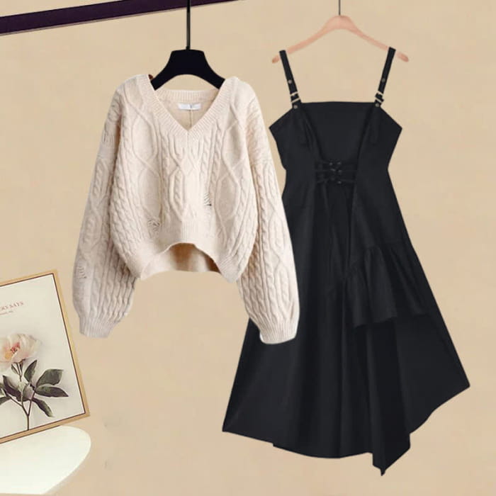 Cable Knit Sweater Lace Up Irregular Slip Dress Set