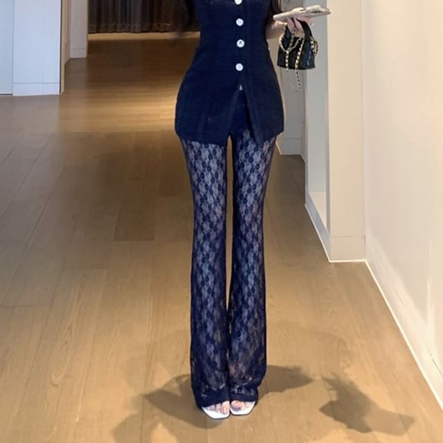 Plain Button Slim Fit Camisole Top / Floral Lace Bootcut Pants