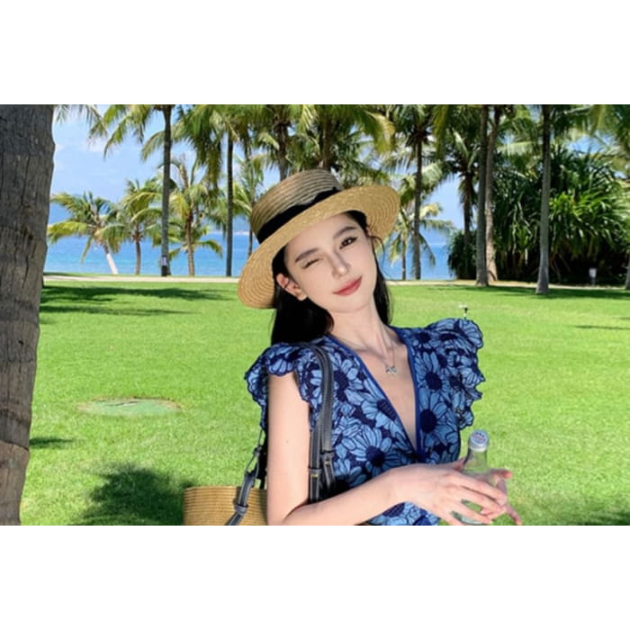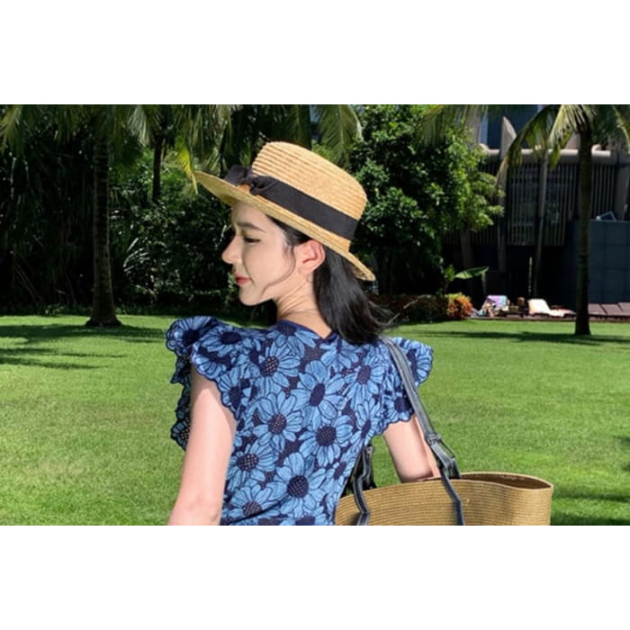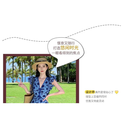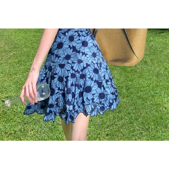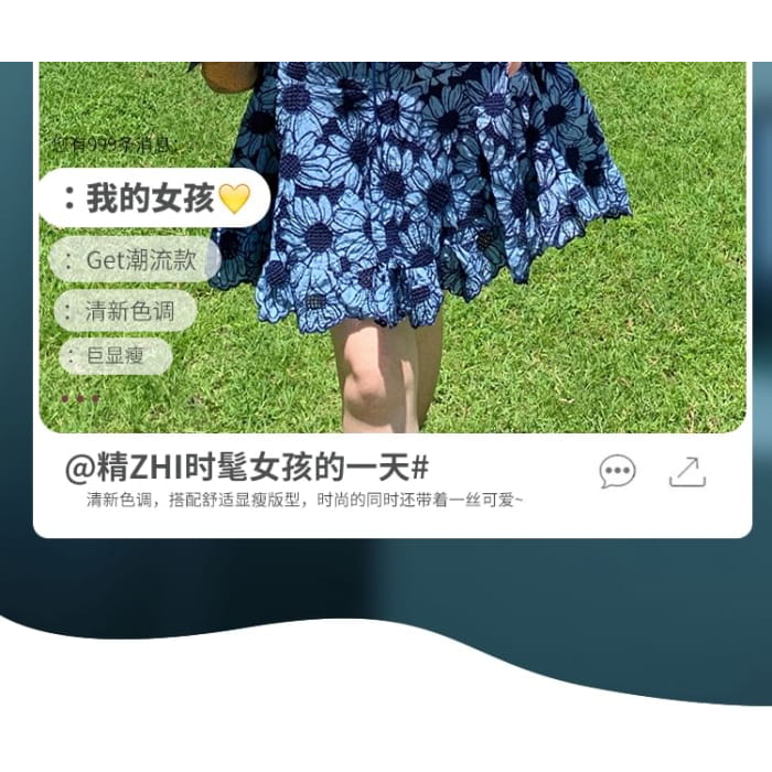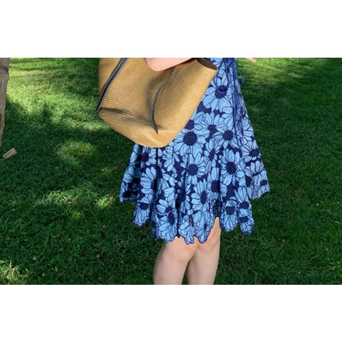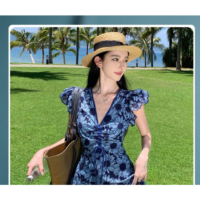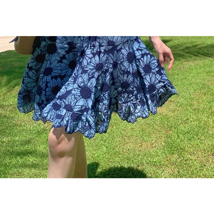 Cap Sleeve V-Neck Floral Embroidered Drawstring Mini A-Line Dress
