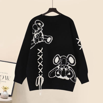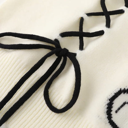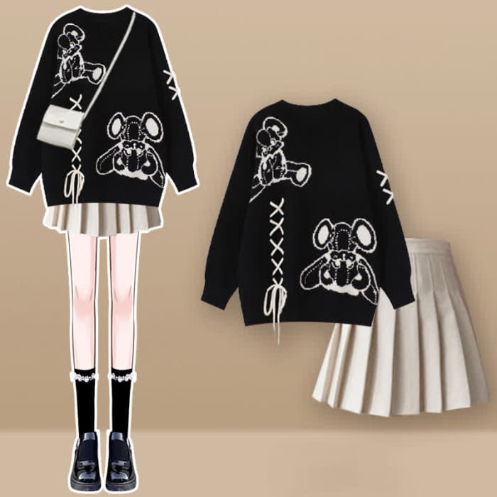Cartoon Bear Lace Up Sweater Pleated Skirt Set