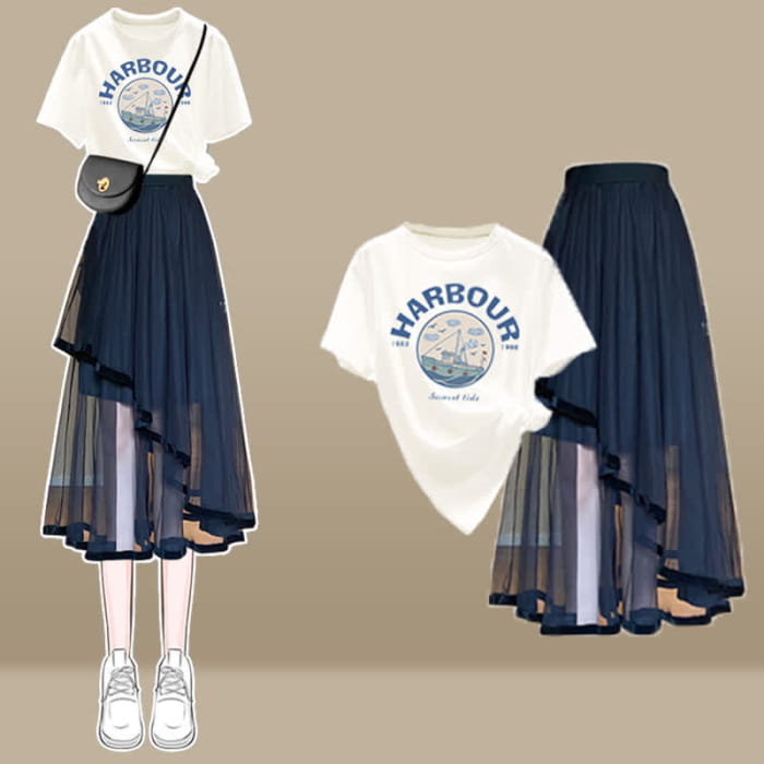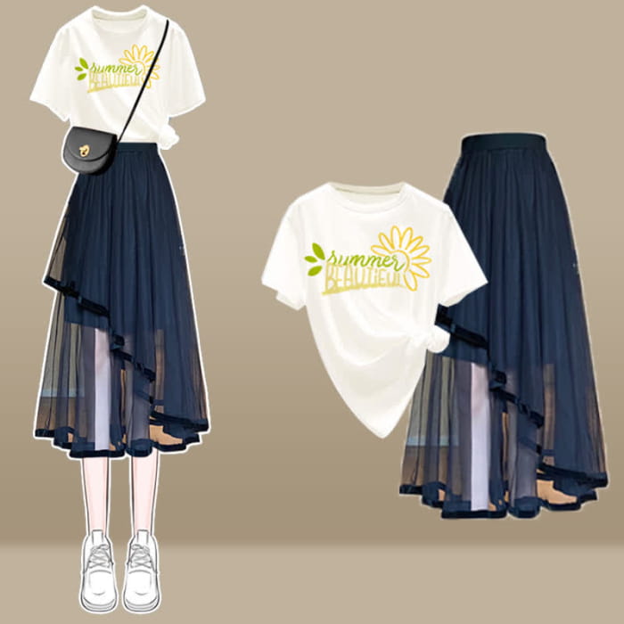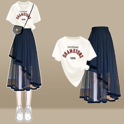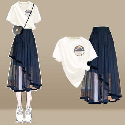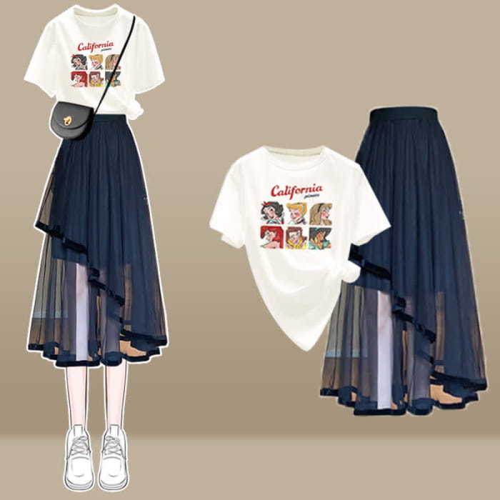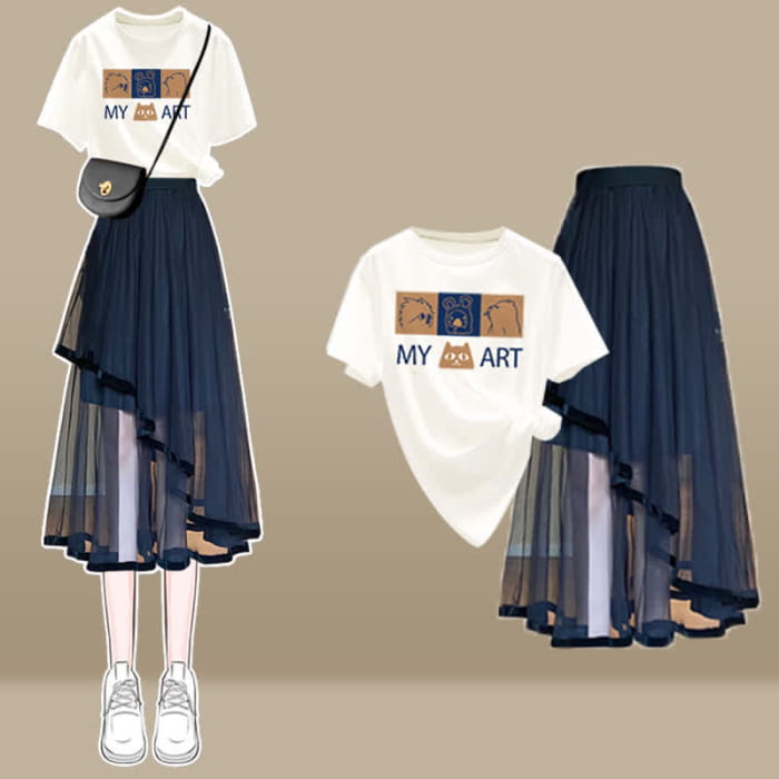 Cartoon Bow Print T-Shirt Irregular Tulle SKirt Set