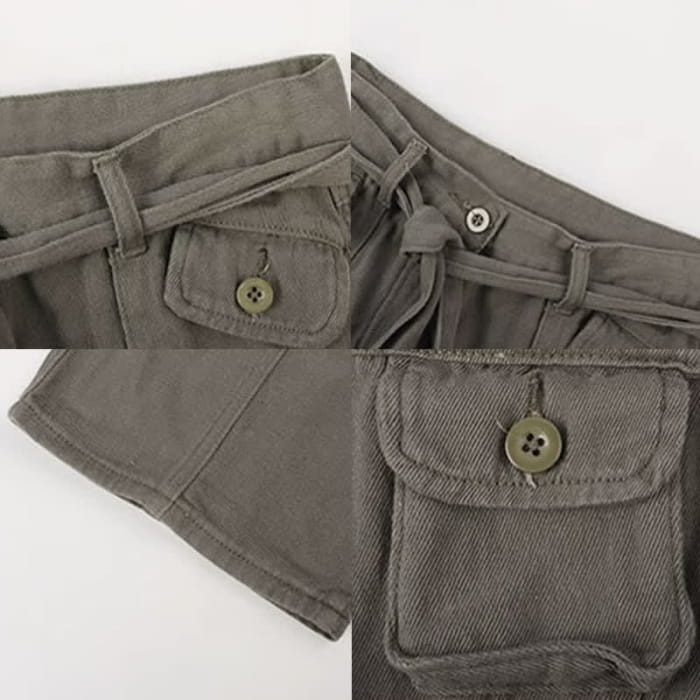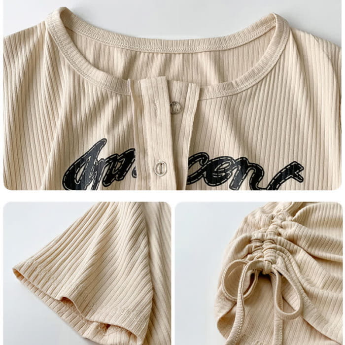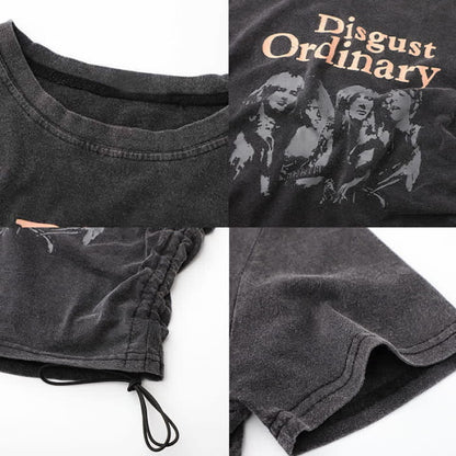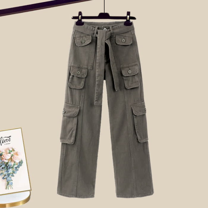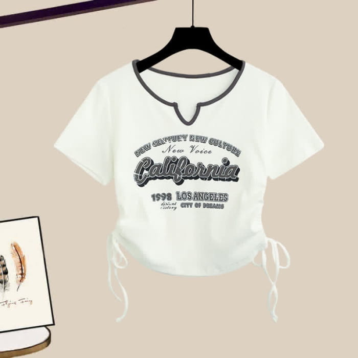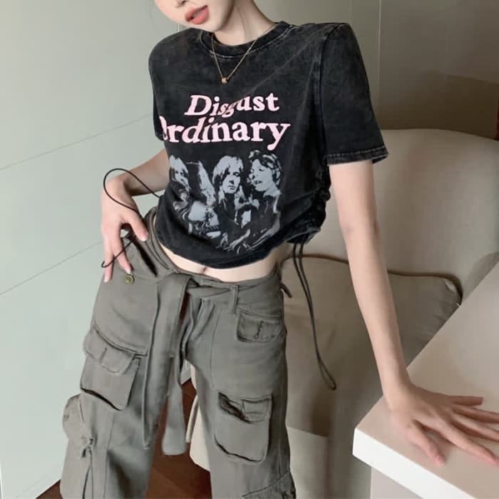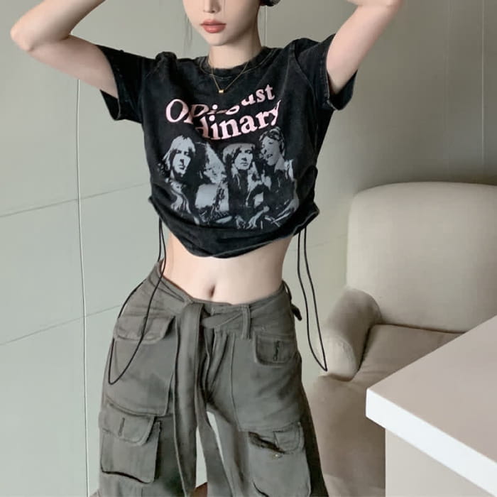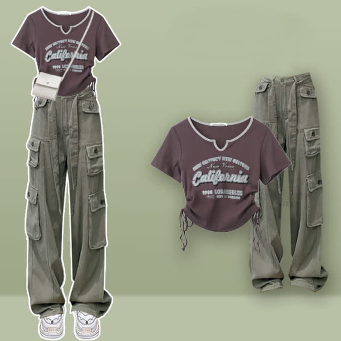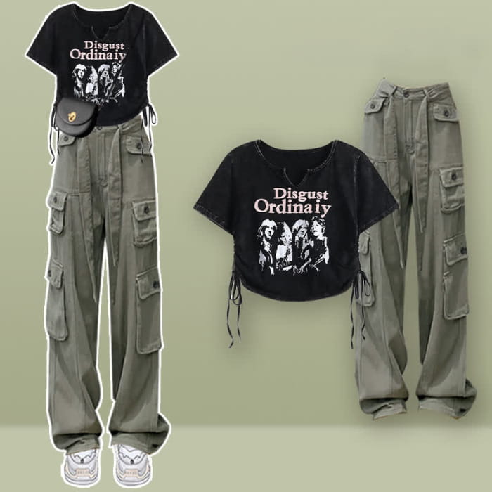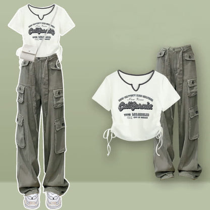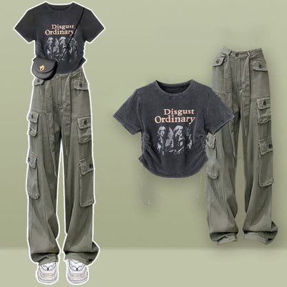 Casual Letter Print Drawstring Crop Top T-Shirt Pocketed Cargo Pants