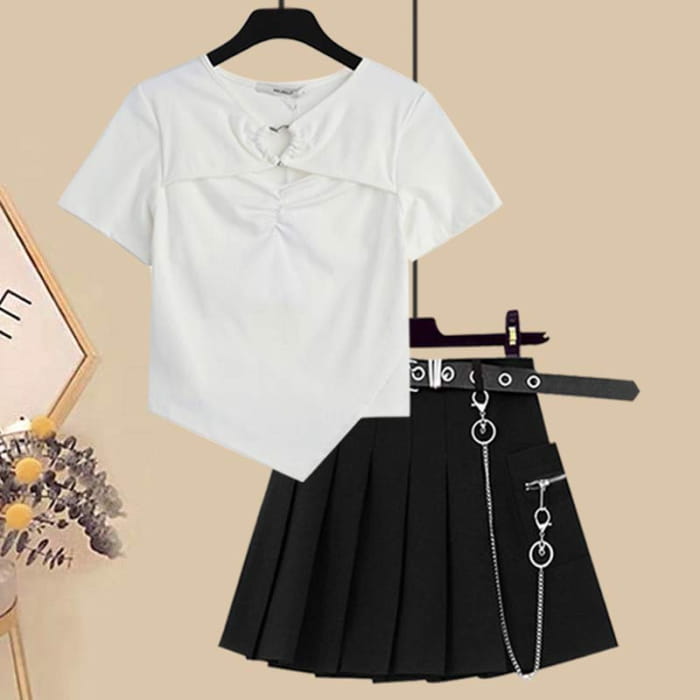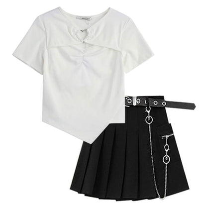 Casual T-Shirt Belted Chain Pleated Skirt Set