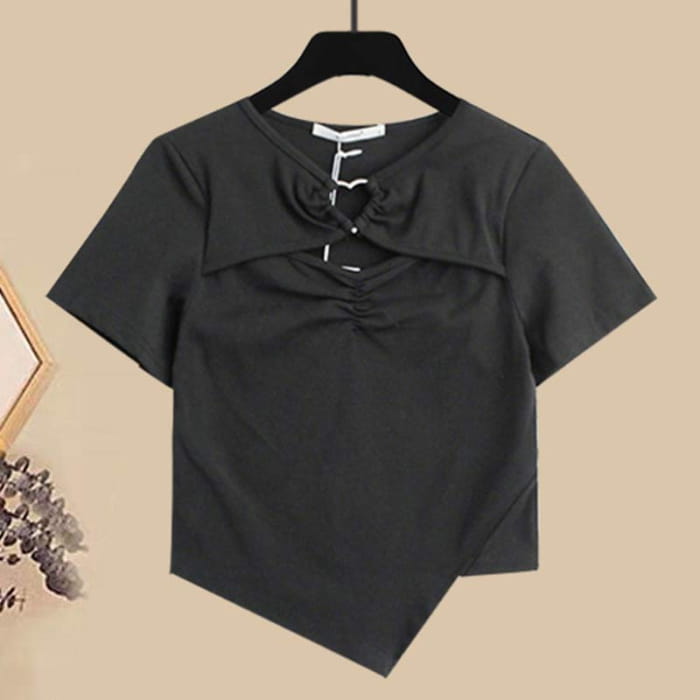 Upgrade your wardrobe with this elegant set. The casual t-shirt is paired with a pleated skirt, adorned with a chic belted chain. Make a statement while staying comfortable in this unique and stylish ensemble. Perfect for any occasion.