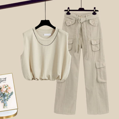 Chain Round Collar Sleeveless Crop Top Casual Cargo Pants