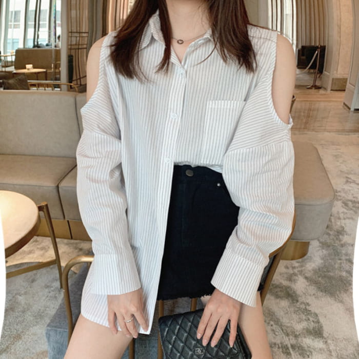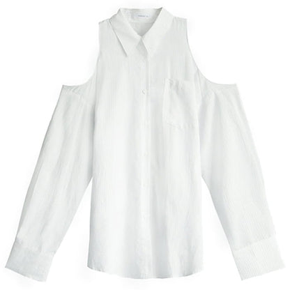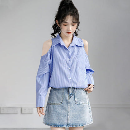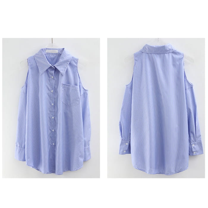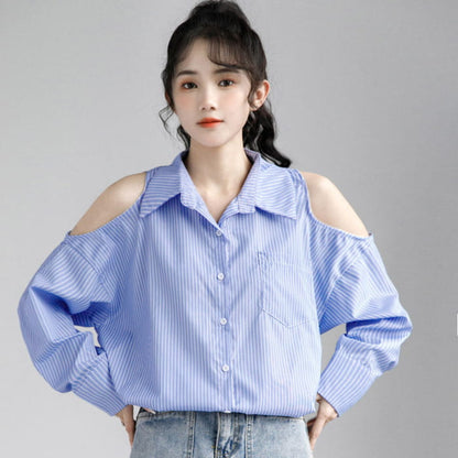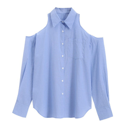 Elevate your style with our Chic Blue Striped Hollow Out Lapel Shirt. Made with elegant design and intricate detailing, it will add a touch of sophistication to any outfit. The striped pattern and hollow out lapel provide a unique and stylish look, perfect for any occasion. Upgrade your wardrobe with this must-have piece.