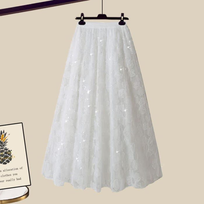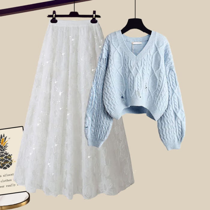 Chic Cable Knit Sweater Flower Pattern Tulle Skirt