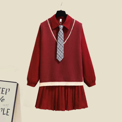 Chic Knit Vest Lapel Tie Pleated Shirt Dress Set