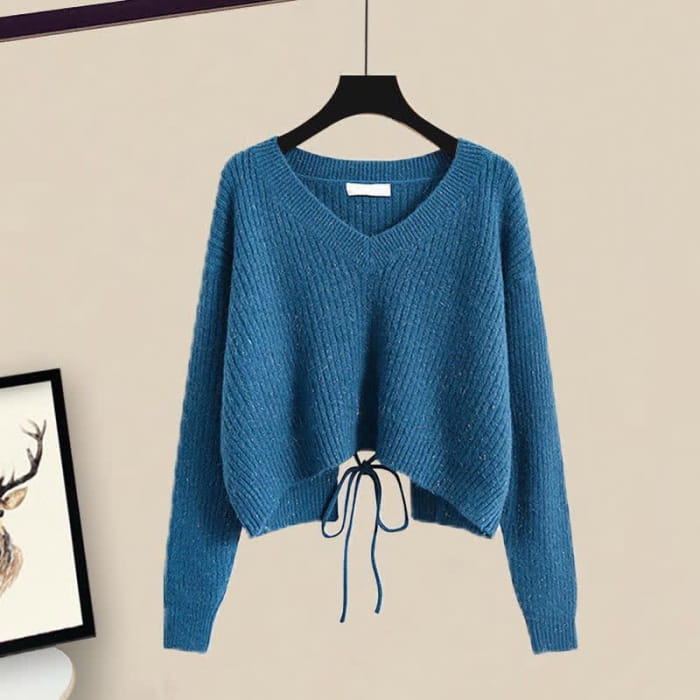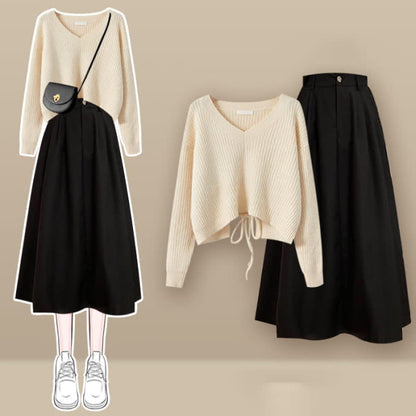 Chic Lace Up Knit Sweater A-line Skirt Set